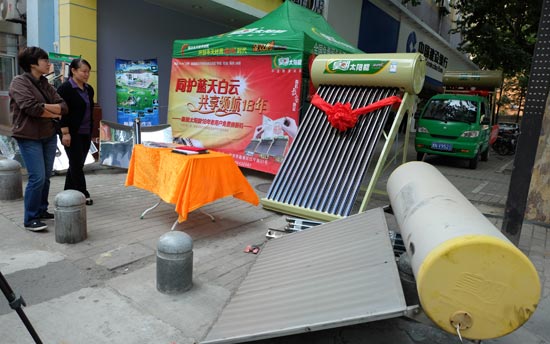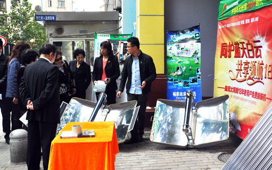 现场展示的皇明研发的新产品--太阳烤煲炫集成,引起了过往市民极大的兴趣